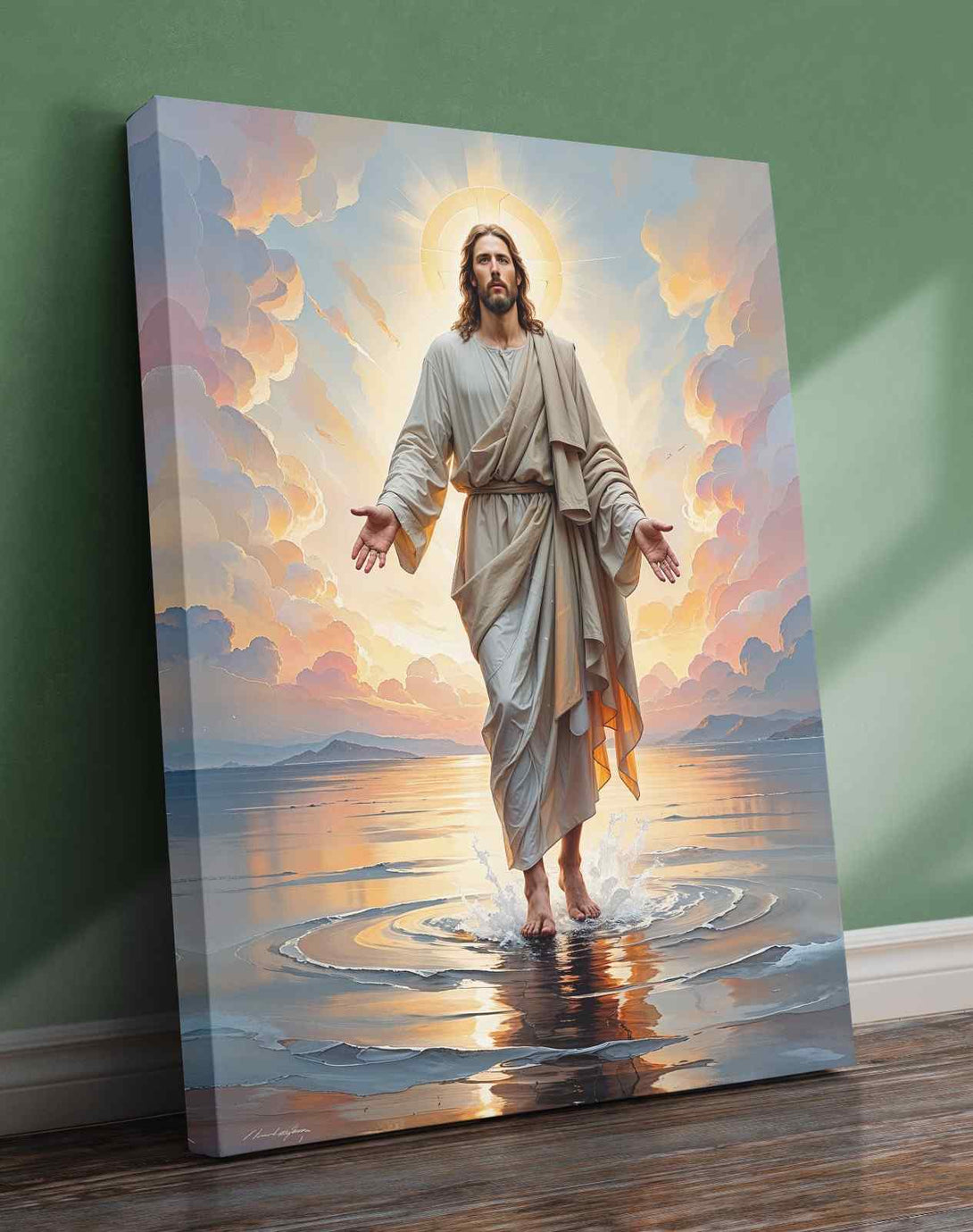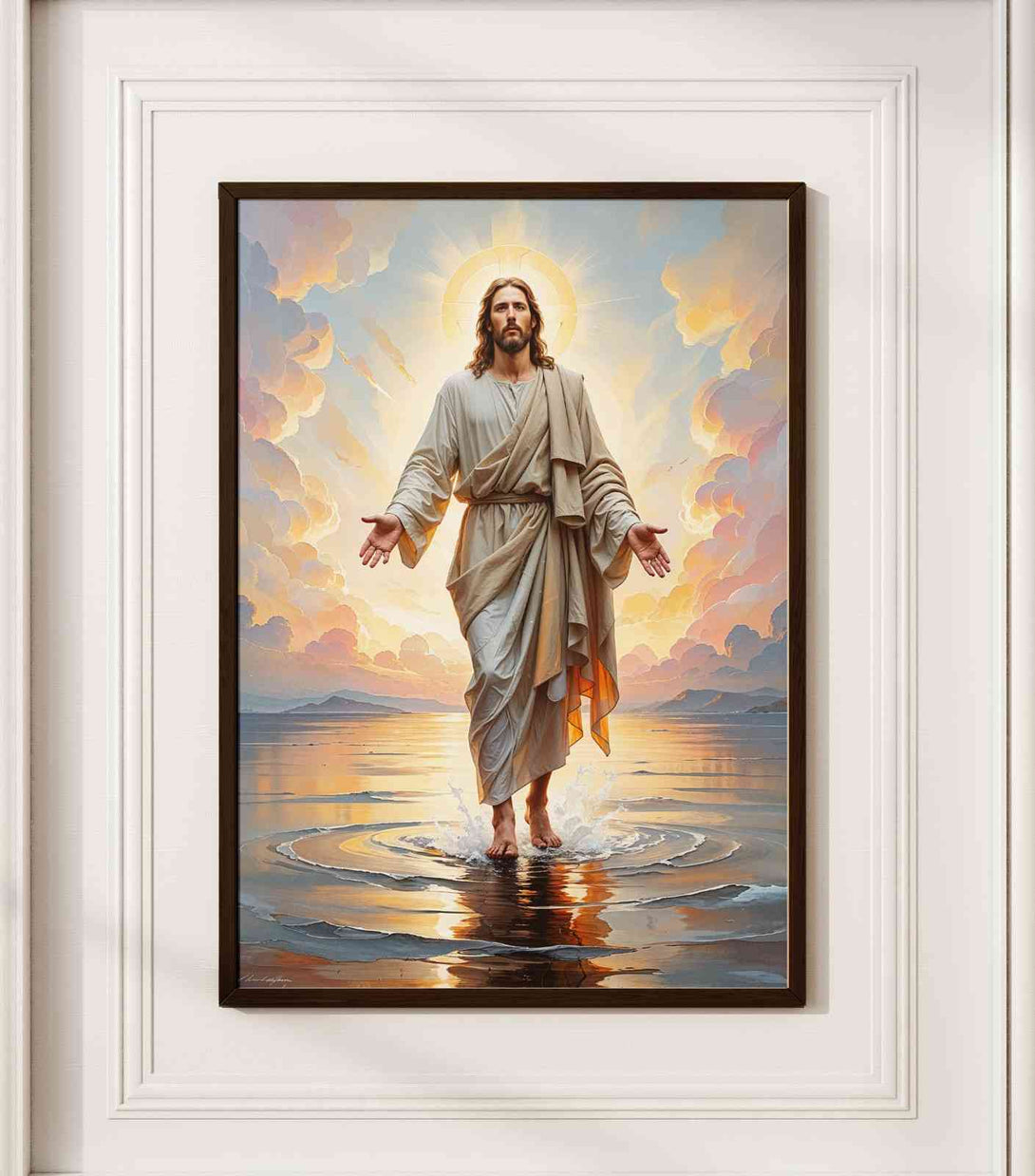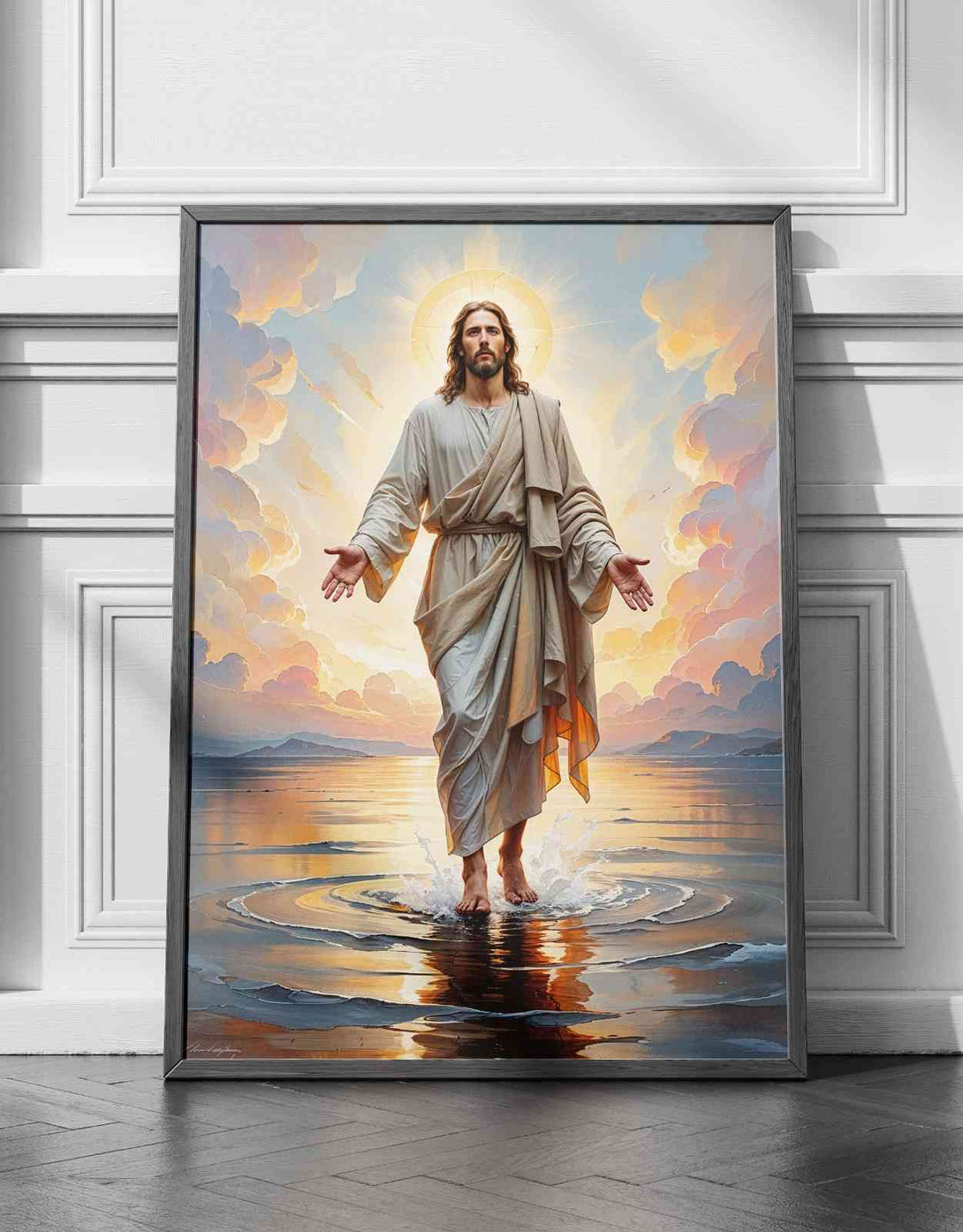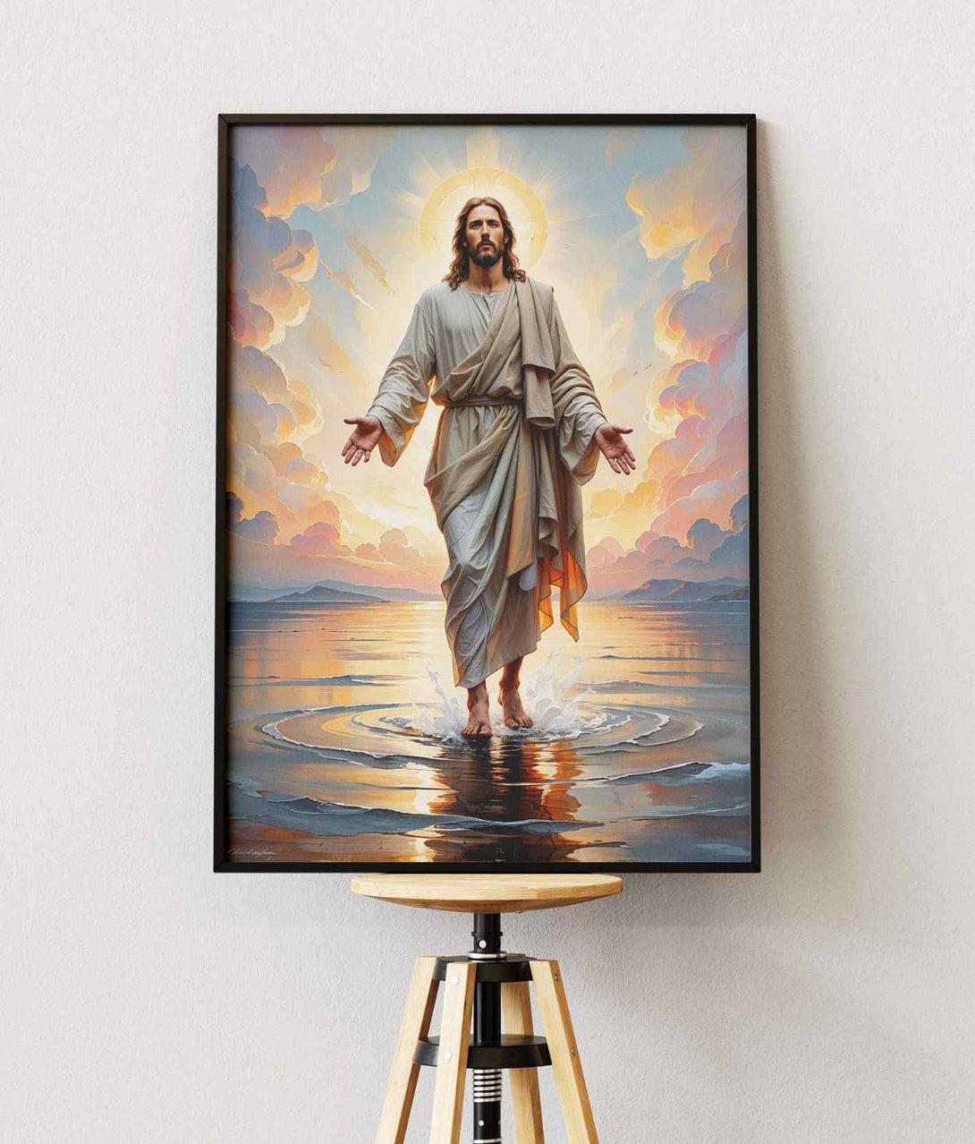 Let your walls reflect the power of faith and focus with “Eyes on Jesus: Walking on Water” — a beautiful scripture-inspired art print capturing the miracle of Jesus walking on the sea. This piece serves as a daily reminder to keep your eyes on Christ, no matter how strong the storm.