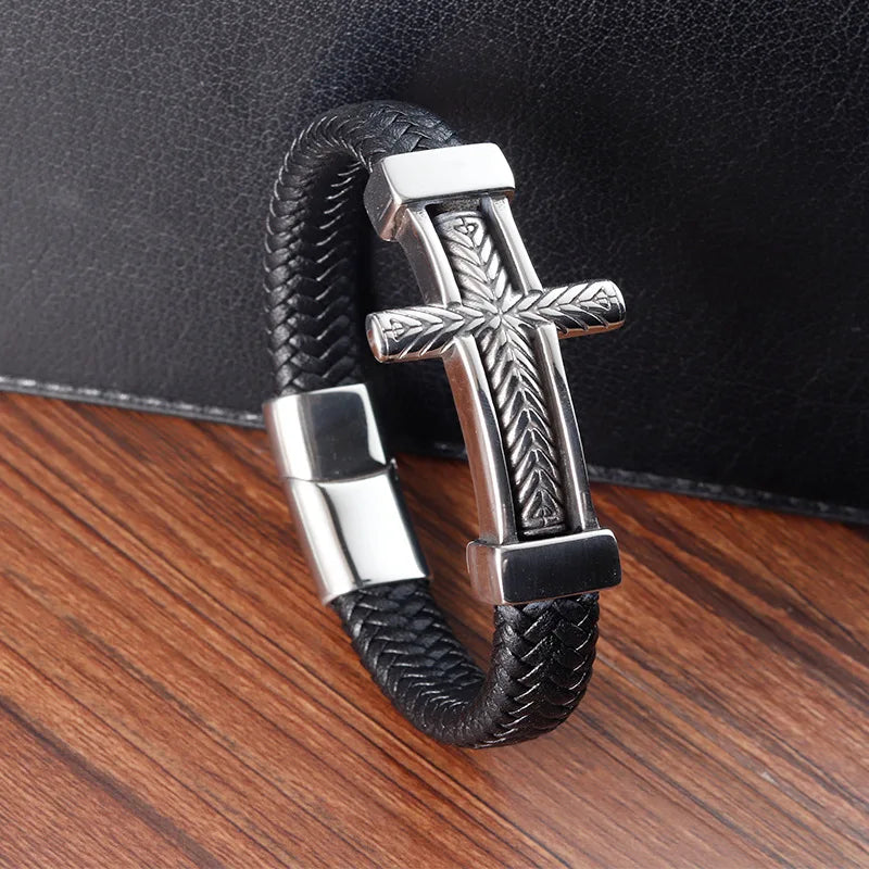 Almost Sold Out โ Crucifix Woven Genuine Leather Bracelet Christian Gift for Men